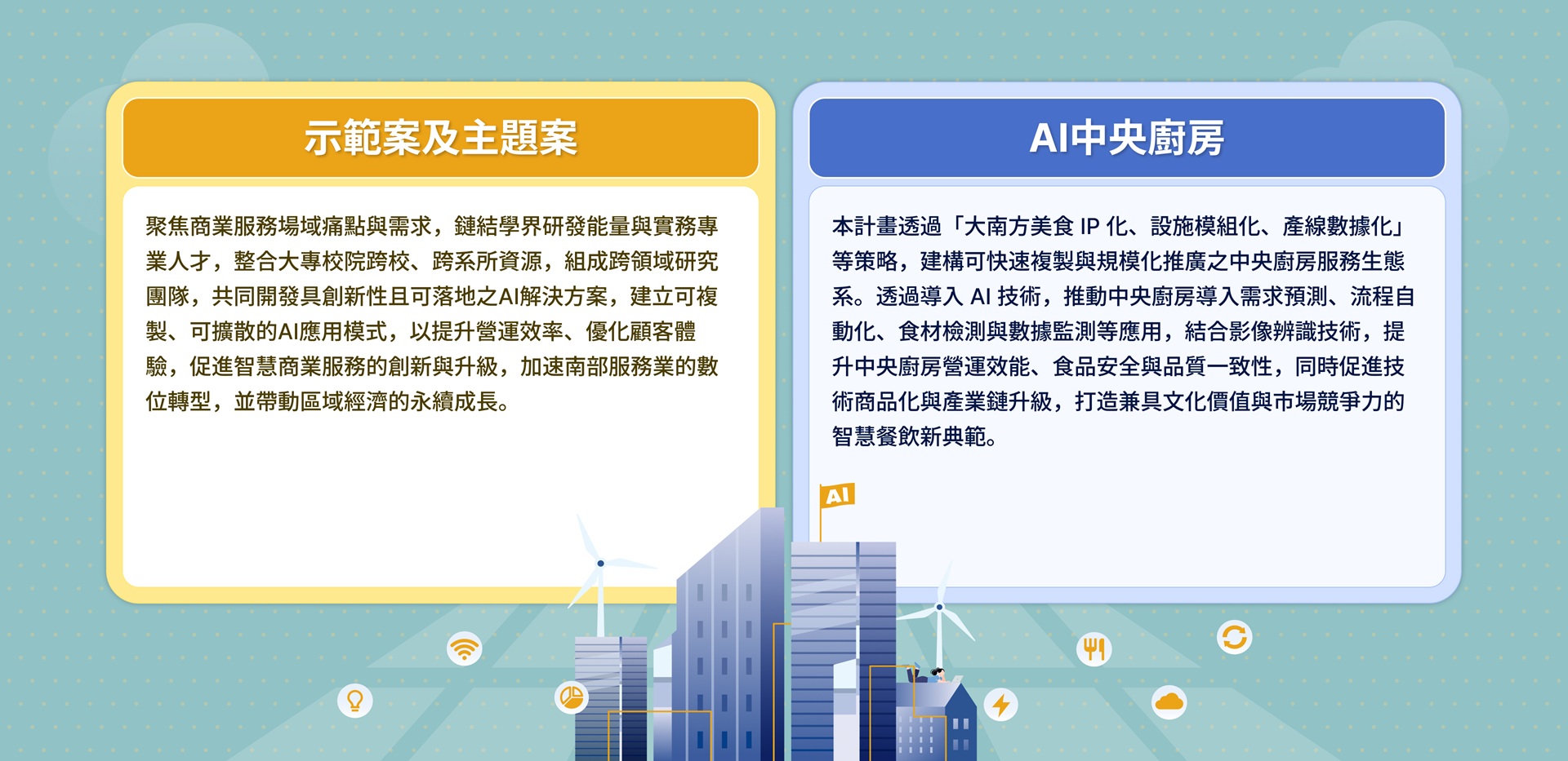為落實「大南方新矽谷推動方案」及「AI新十大建設推動全民智慧生活圈」,本計畫以人工智慧(AI)技術為核心,推動大南方地區(嘉義、臺南、高雄、屏東)商業服務業的智慧化與數位轉型。藉由鏈結產業、學研與技術資服能量,整合跨域研發與創新解決方案,促進創新商業模式之發展,帶動產業升級並提升區域競爭力。