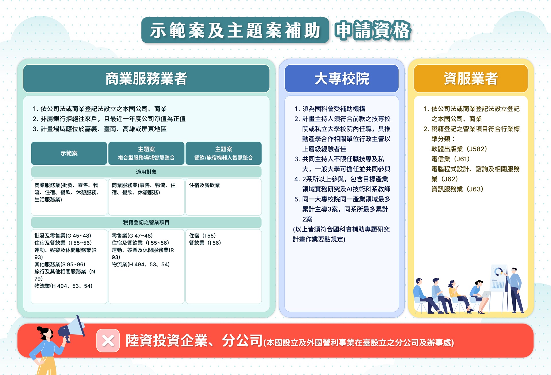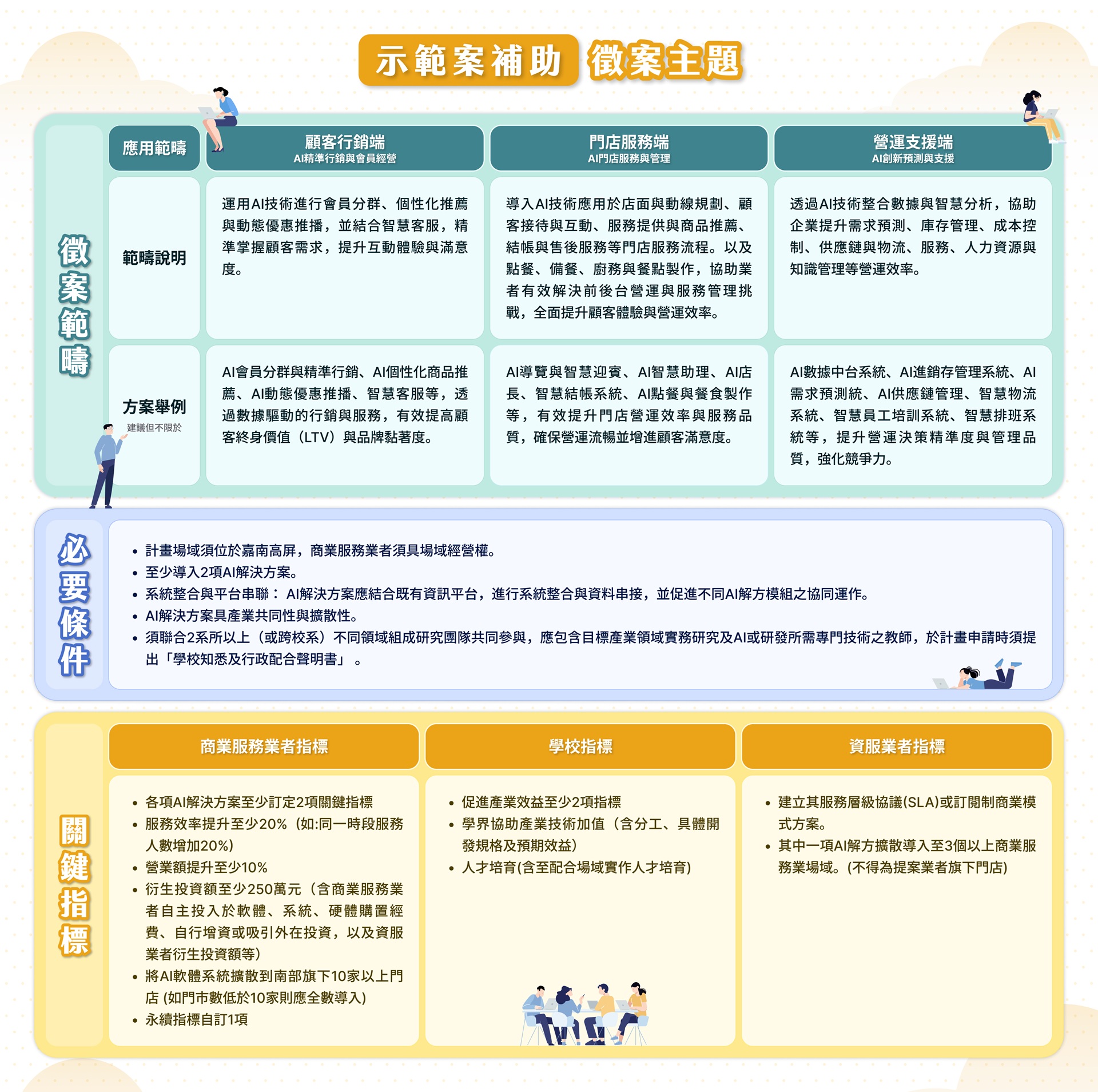 本計畫由商業服務業者及大專校院聯合資服業者三方協作共同提案,並以商業服務業者為主要提案者,且計畫場域應位於嘉義、臺南、高雄、屏東。